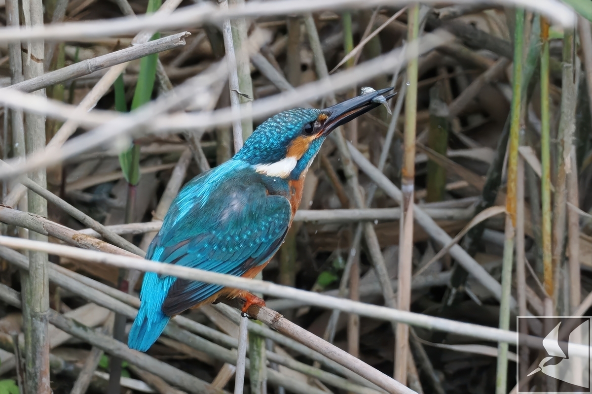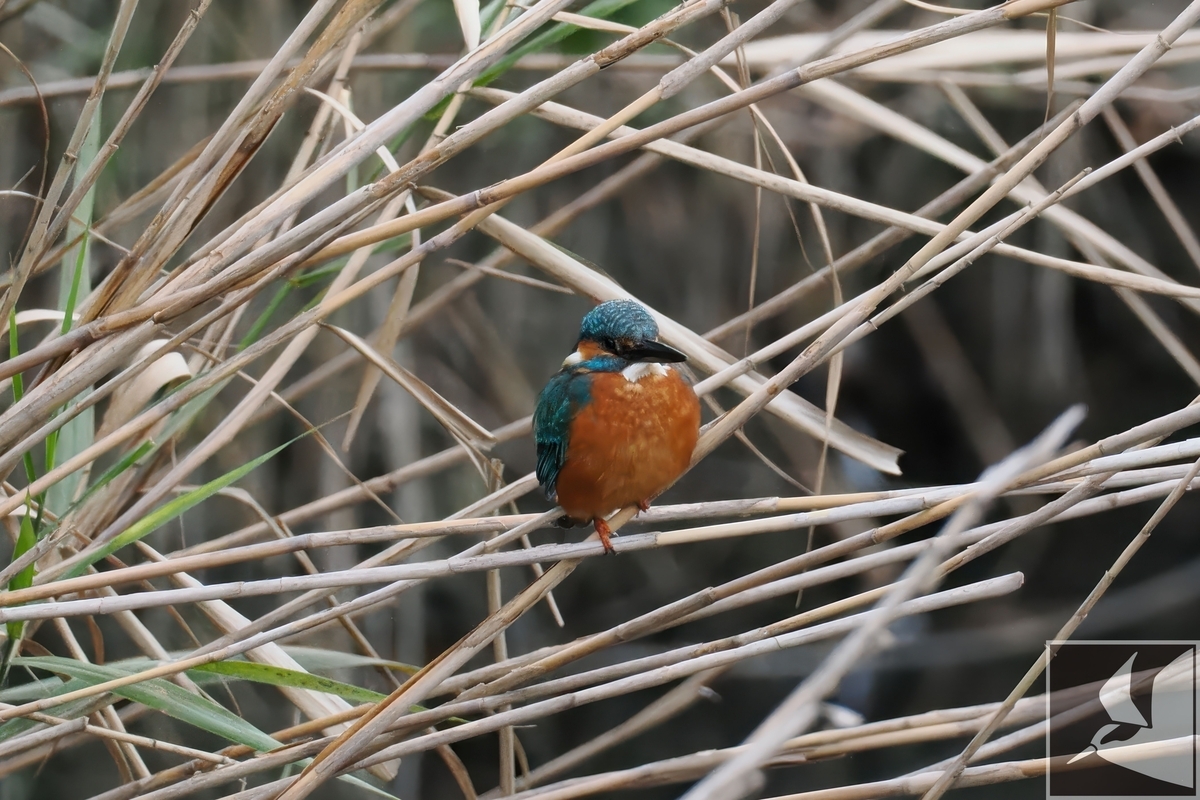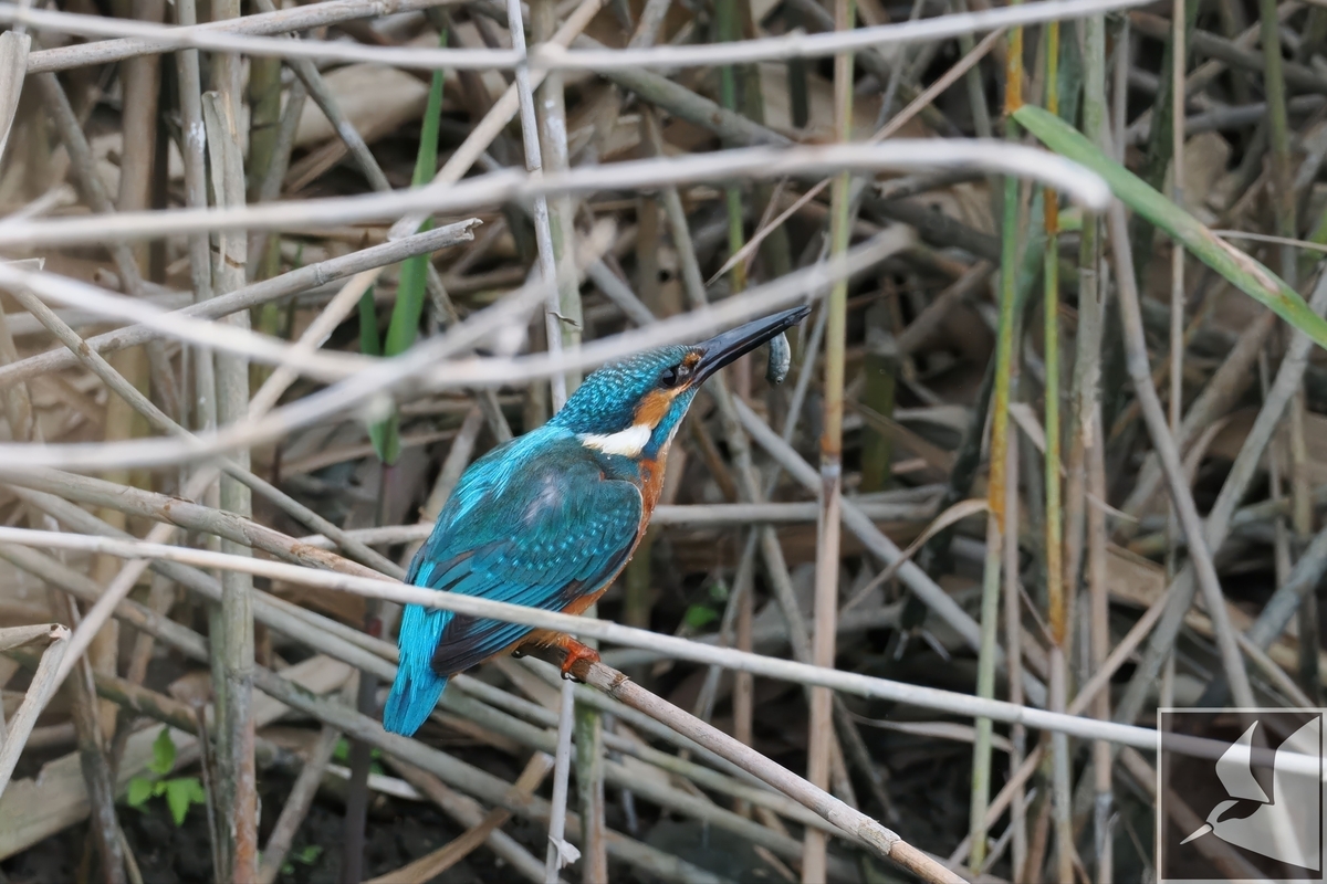 葦にとまり獲物を探すカワセミ。
